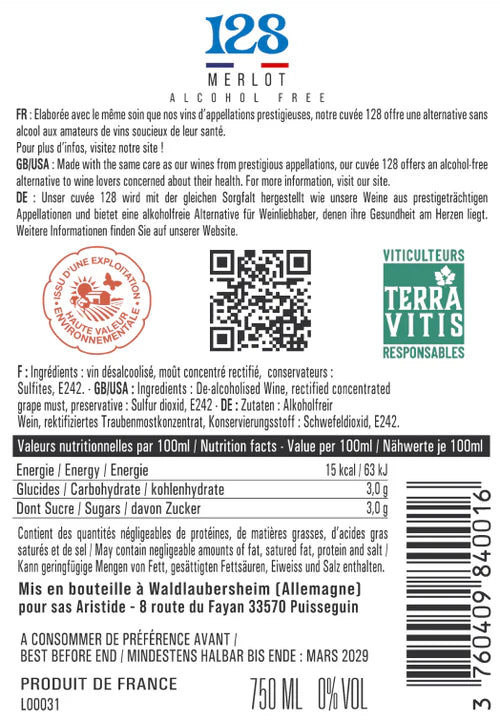 La cuvée 128 est un vin désalcoolisé fruité, apportant de la douceur en bouche et un profil tannique maîtrisé avec une belle longueur en bouche.